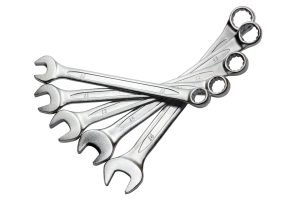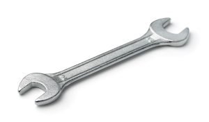 A single-piece wrench with an opening in the shape of a U holds two opposing sides of the nut or bolt.